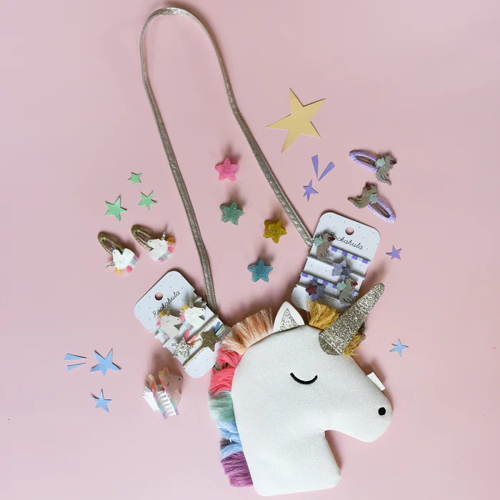 Wir glauben an Einhörner – und du auch! Unsere Regenbogeneinhorn-Tasche ist aus superweichem, weißem Glitzer gefertigt und hat eine leuchtend bunte Regenbogenmähne sowie ein glitzerndes goldenes Horn. Die Tasche verfügt über einen Magnetverschluss, ein goldfarbenes Sternenfutter und einen verstellbaren goldenen Trageriemen mit Sicherheitsverschluss.