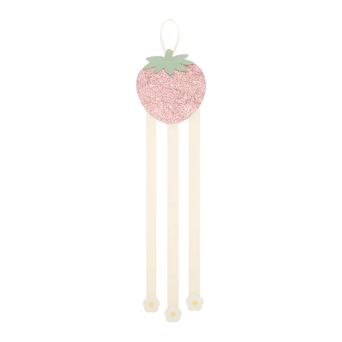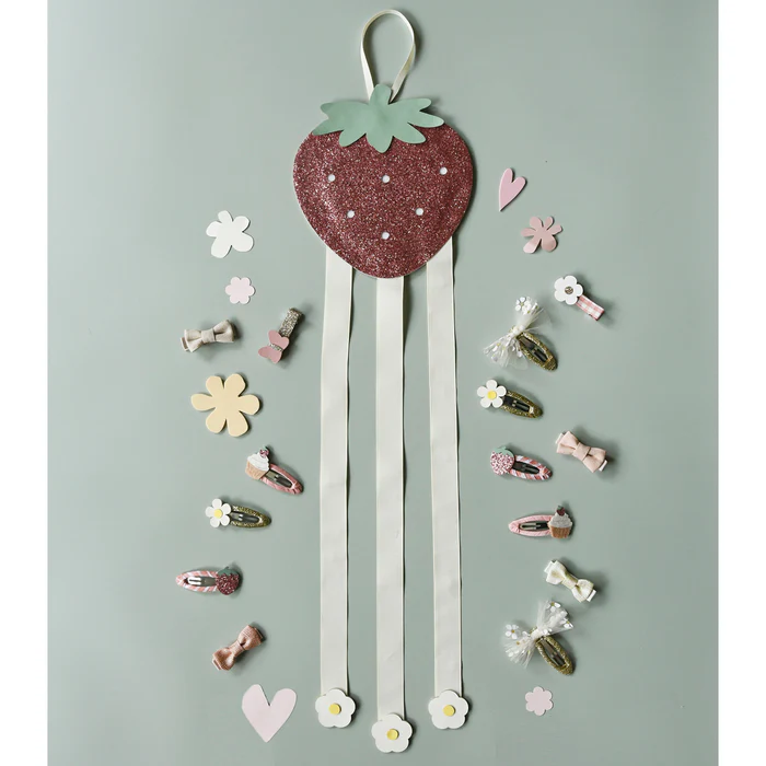 Die perfekte Lösung, um Haarspangen sicher und ordentlich aufzubewahren! Mit einer süßen kleinen Erdbeere und drei Aufhängestreifen bietet dieser hübsche Spangenhalter Platz für ca. 39 Spangen (je nach Größe) und lässt sich perfekt an einer Schlaufe aus Ripsband befestigen! Gesamtlänge: 66 cm. Aufhängebereich für Spangen: 37 cm.